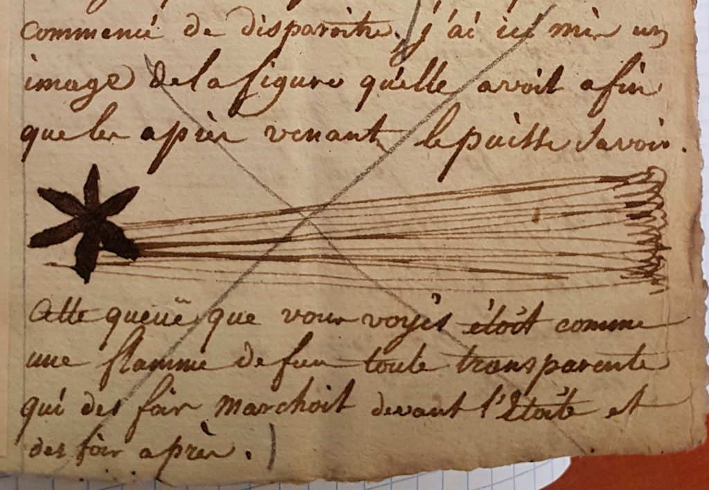 Une perle: le carnet d'Abram Boive, pasteur à Cornaux. Il ici, il décrit la venue d'une comète. Il la dessine. Il dit :